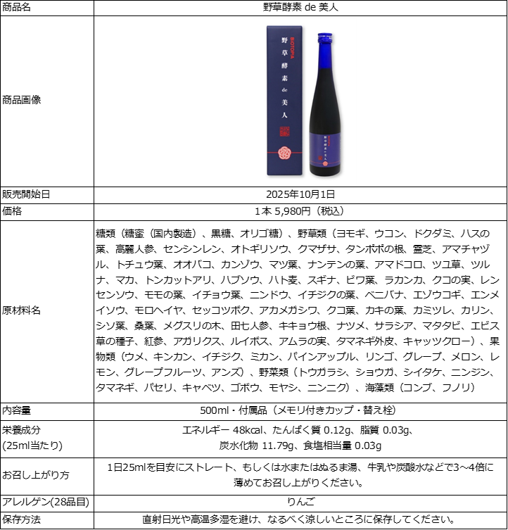 株式会社ブルックス(本社:神奈川県横浜市、代表取締役社長:小川裕子)は、BIOTOPIA(ビオトピア)より、発酵のチカラで美容と健康をサポートする酵素ドリンク『野草酵素de美人』を2025年10月1日に新発売いたします。