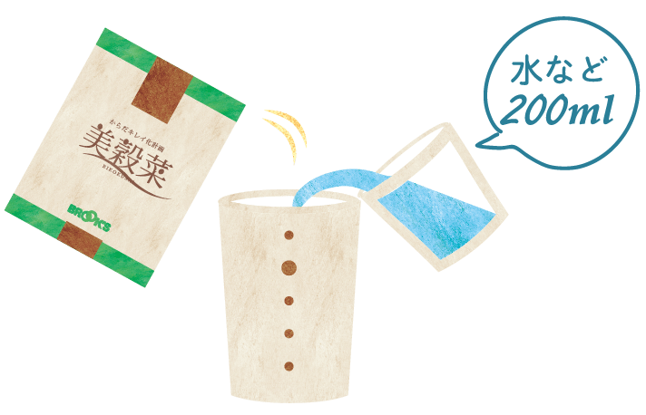 シェーカーに常温または冷たい水(または牛乳、豆乳、アーモンドミルク)を 200ml 入れ、美穀菜1袋を入れます。