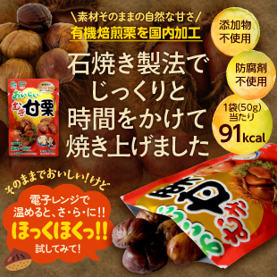 有機栽培の栗をじっくり時間をかけ石焼製法で焼き上げたむき甘栗です。