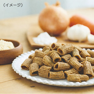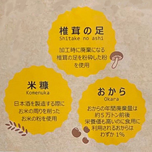 捨てられるおから、日本酒を作る際に削られる米粉、出荷の際にカットされる椎茸の足を使ったマカロニ型のお菓子です。