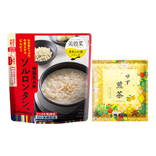 韓国の代表的な料理「ソルロンタン」をお粥にアレンジしました。シールド乳酸菌Ⓡ100億個配合と高知県の柚子の皮を使用した柚子と緑茶の爽やかな組み合わせのすっきりした味わいのお茶とのセットです。