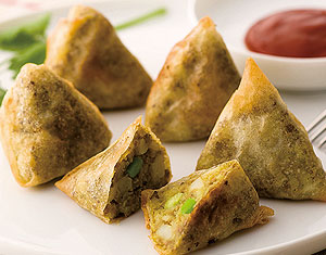 - 春巻きの皮を1/2の長方形に切り、まわりに小麦粉のりをつけ、具を乗せて三角すいに包む。